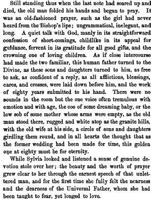 Finishing up chapter V in the 1864 version of Moods (“The Golden Wedding”), I walked away with two thoughts, regarding Louisa’s spirituality and her romanticized self in Sylvia Yule.
