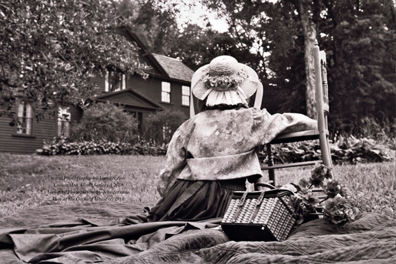 Jennifer comments, “This photograph was taken at the Orchard House on an early August morning. A quick summer rain blew through, perhaps you can see the raindrops in the photograph online. The props were selected with care: (1) The chair “May” has her arm on is an exact duplicate as the chair in her bedroom in the Orchard House. (2) Geraniums by her side and a small lunch basket from the 1860’s. (3) I loved May’s spirit and love for color, even though she is photographed in black and white, her personality shines through dressed in favorite tapestry of color, topped with a blue lace hat. This image was to present the story of May’s painting of the Orchard House which can be viewed as one tours the home.”