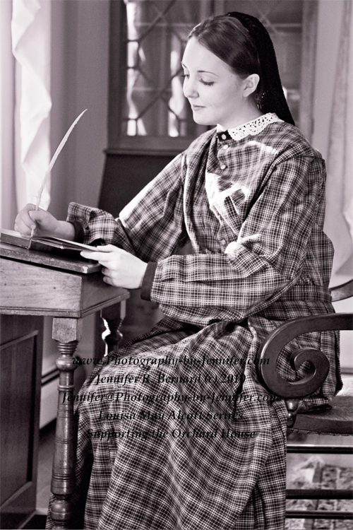 Jennifer’s comments: Here she is, Louisa May Alcott re-enactment. The furnishings are all copies of what is found in The Orchard House today. The lace on dresses collar is from the 1860’s. Hitchcock desk chair: 1830’s; Secretary: 1830″s; Desk: 1840’s; The staging room: 1740’s; The book: “Flowers and Fables” (1854); The model, a beautiful young Louisa May – no make up or pins in her hair – all snood :); No flash, no filter, all natural light.; Black and white silver film hand developed.