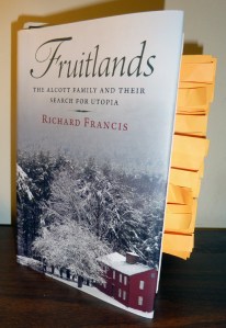 Speaking of such, it would appear that now is the right time for me to read Richard Francis’ work, Fruitlands: The Alcott Family and Their Search for Utopia. I have been putting off reading this book because I was frankly intimidated by the subject and the author who has amazing credentials. As reported in a previous post, Francis gave a presentation in Concord about his book and I was very taken by his intellect, and his dry wit. I knew, however, this book would be a dense read, requiring quite a commitment. Since I take notes while I read and I read slowly, this is a long term commitment. I am happy to report that it is well worth the time! This book is fabulous. Francis is not only witty and brilliant, but he does such a great job of making connections and translating the rather obtuse language of Ralph Waldo Emerson and especially Bronson Alcott into something I can readily understand. You can see by the picture that my book is already full of sticky tags waiting for notes to be taken.:-) Finally I am beginning to get the answers I’ve been searching for about what Transcendentalism is, who founded it (the cast of characters is amazing) and how the prevailing religion of the 19th century influenced it. Some of the ideas are incredibly preposterous and yet there’s truth stuck in there too; Francis’ wit helps to extract that truth. It’s an incredibly stimulating read. It is true that the book takes a lot of time laying out the groundwork (I understand that he doesn’t even get into the actual Fruitlands experiment in Harvard, MA until halfway through the book, but he does explain why in the preface).