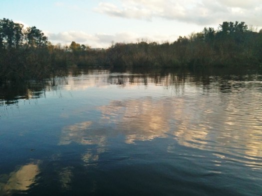 We had just had a big rain storm so the water level was high and the current strong, making for a vigorous paddling workout. The colors at sunset were golden and lovely.