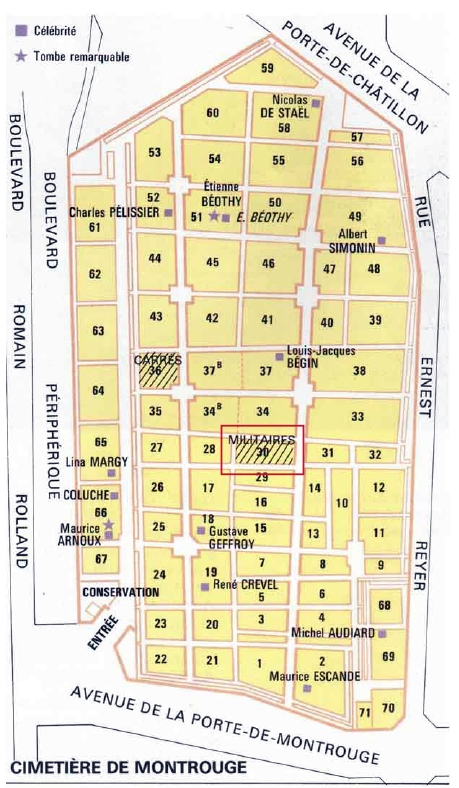 In the 1870s, information at Montrouge was not organized in the same way as it is now (with everything computerized). Therefore, Claire was only able to find out that May had been buried in the 30th section. The cemetery is much larger now than it had been in 1879 which explains why, with the available information, it is not possible to exactly pinpoint where her grave had been.