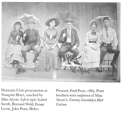 Anna writes, “I went to Nonquit[t] where Louisa had a cottage, a lovely green paradise which offers everything one can wish. Here I rested, and for fun got up theatricals (as usual), charades, etc., and grew quite young and festive, and enjoyed my lark so much I didn’t not want to come home . . . we [Louisa and Anna] take turns and so keep our boys there eight or ten weeks.” (pg. 141, The Alcotts As I Knew Them by Clara Gowing, e-book version).