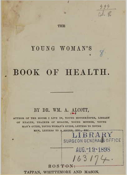 Dr. William Alcott was the cousin of Bronson Alcott. He was passionate about education as a boy which greatly influenced Bronson. - Alcott, William A. The Young Woman’s Book of Health. Boston, 1850.