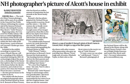 The Union Leader out of Manchester, NH ran an article on April 1st highlighting one of their own. I’m proud to say she is one of ours too! Jennifer Bernard, whose pictures you’ve seen on this blog, was honored by the Concord Free Library of having her photo of Orchard House included in their special tribute to the historic museum celebrating its centennial. Read below for details.
