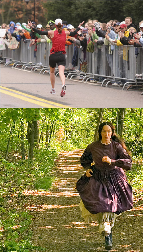 Top: elite women runner passing Wellesley College (boston.com); below from Louisa May Alcott The Woman Behind Little Women (alcottfilm.com)
