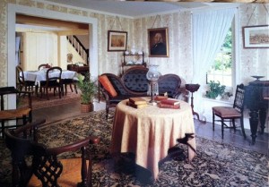 The interior of the home was distinguished with plain and unpretentious décor. As an example, he described the windows as uncluttered with the usual array of curtains, shades and blinds which blocked the sun. Instead they were adorned simply with “pretty muslin curtains, made out of old party dresses:; the trees outside “temper[ed] the light.”