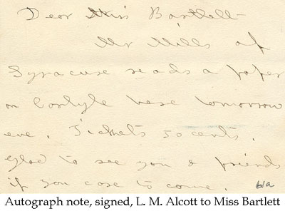 This last Concord tidbit has local meaning for the Concord Free Public Library, where Miss Sarah Ripley Bartlett—daughter of the engaged couple, who were married in 1881—served as librarian from 1920 to 1953. The new letter thus connects with Bartlett family papers in the Special Collections as well as with Alcott holdings in print and manuscript.
