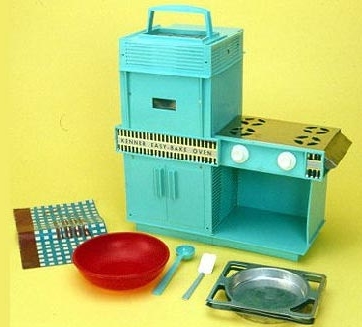 Reading the description of the child-sized stove and dishes, I thought back wistfully to the fun so many girls my age had with the Kenner Easy-Bake Oven. What a thrill it was to bake our own cupcakes, tiny as they were, in our own ovens. And then there were the Girl Scout cooking badges you could earn by learning how to prepare meals for your family. Never being good at cooking, I didn’t learn much but it was a lot of fun.