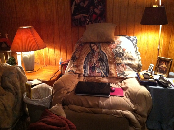 I claimed my son’s large basement bedroom and furnished it with a love seat, lounge chair and prints made of collages that I created from “The Most Beloved American Writer” series in the Woman’s Home Companion magazine from 1938 which I bought from Ebay (see previous post). The series was written by Katharine Anthony (featuring excerpts from her biography on Louisa May Alcott) with paintings and drawings of scenes from Little Women by Norman Rockwell.