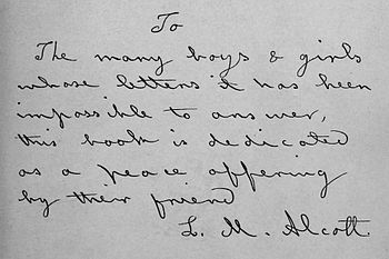 Hand written dedication by Louisa May Alcott from a first edition copy of the novel Eight Cousins, 1875 (Photo credit: Wikipedia)