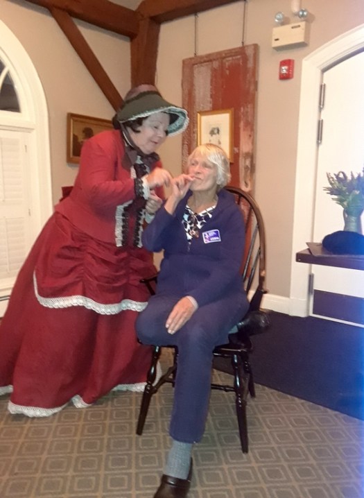We were then treated to “Louisa’s” personification of Sairey Gamp, a favorite Dickens character used to entertain her patients. A brave audience member volunteered to help with the skit.
