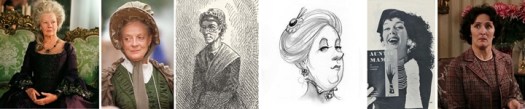 L to R, Lady Catherine de Bourgh, Betsey Trotwood, Aunt Polly, Aunt Dahlia, Auntie Mame, and Aunt Petunia.